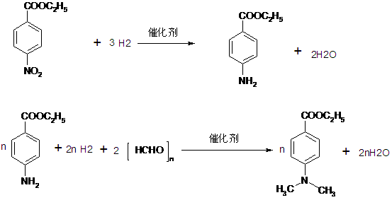 | 2 | 4m3二甲氨基苯甲酸乙酯(苯佐卡因)反應釜:采用自吸式攪拌機后,在其他工藝條件不變的情況下,后一步加氫時間由原來的16小時縮短到10小時左右,而且我們在生產(chǎn)過程中發(fā)現(xiàn)催化劑的使用了下降,每投一次催化使用時間比原來使用要長,統(tǒng)計后平均每釜料大約能節(jié)約30%的催化劑用量。 反應釜規(guī)格:3m3(ZX-3) 50°C 操作壓力:0.7MPa 主反應方程式: ![]() |
