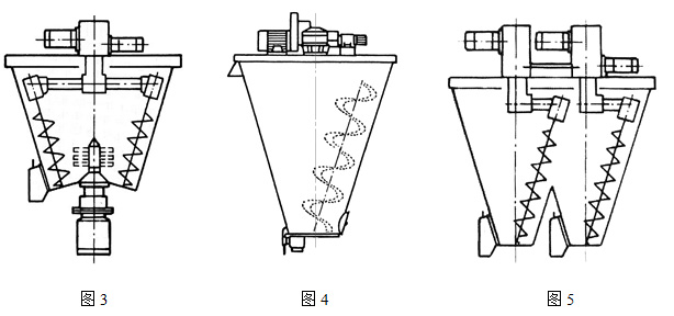 7、如圖5所示兩錐體結(jié)合成一體,為雙錐雙螺旋結(jié)構(gòu)。此結(jié)構(gòu)可在保持體積不變的同時(shí),大大降低錐體的高度,適合于設(shè)備的大型化及大生產(chǎn)。