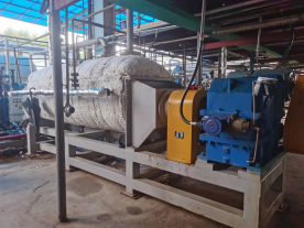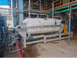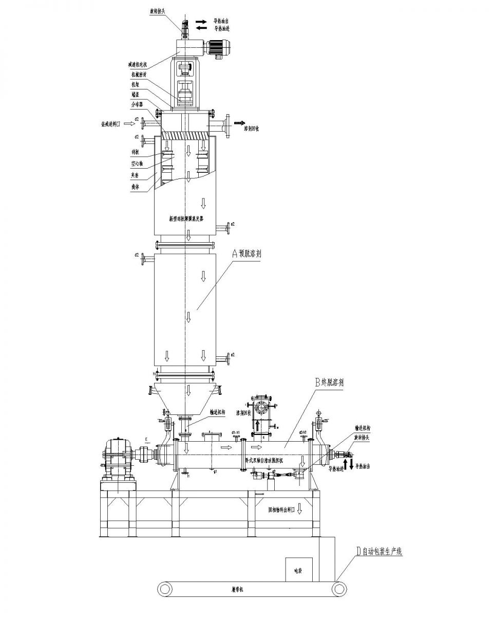 方案1:利用索孚專利產(chǎn)品臥式單自清潔薄膜蒸發(fā)器和臥式雙軸自清潔干燥機(jī)在高溫330C°以下和真空-0.095MPa左右條件下,回收大部分有用高沸物溶劑產(chǎn)品,最終殘留量≤0.2%,再將釜?dú)垙U鹽等直接干燥固化破碎處理;(物料特性:溶劑脫除完畢直接固相析出和通過(guò)高溫催化裂解成固相物料,例如:廢鹽釜?dú)?,苯二酚釜?dú)?,甲基丙烯酸釜?dú)?,二甲?咪唑啉酮釜?dú)?,亞硫酸氫鉀鹽干燥,二甲基亞砜(DMSO)釜?dú)執(zhí)幚?,染料中間體廢活性炭干燥處理,污泥等等)