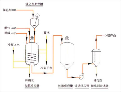 液相催化加氫的工藝流程一般包括氫化反應系統(tǒng)、催化劑過濾系統(tǒng)和其他氫源、取樣、冷卻、產品精制等配套系統(tǒng),不同工藝需要不同工藝流程和設備。反應系統(tǒng)一般設計成間歇生產,特殊要求時也可設計成連續(xù)生產。